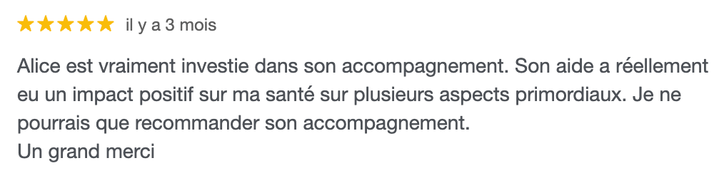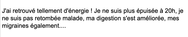 En prenant en main tes carences et ton inflammation, ta fatigue s’est peu à peu atténuée. Ta nuit de 8h te suffit à te sentir pleinement en forme et tu fais même du sport le soir en rentrant (et dans la joie et la bonne humeur).